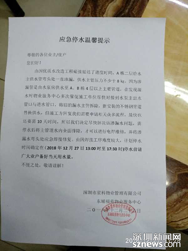 據(jù)了解,自本網(wǎng)報道此事件后,沙頭角街道便聯(lián)動?xùn)|埔福苑小區(qū)物業(yè)公司于2018年12月26日發(fā)布小區(qū)應(yīng)急停水公告。公告表示,將盡快解決供水管漏水問題,在停水后將主管道水內(nèi)全面排除,進行電焊維修,并在滲漏水彎頭處應(yīng)急焊接修復(fù)。為保障施工順利進行,小區(qū)停水時間為:2018年12月27日13:00至17:30。
