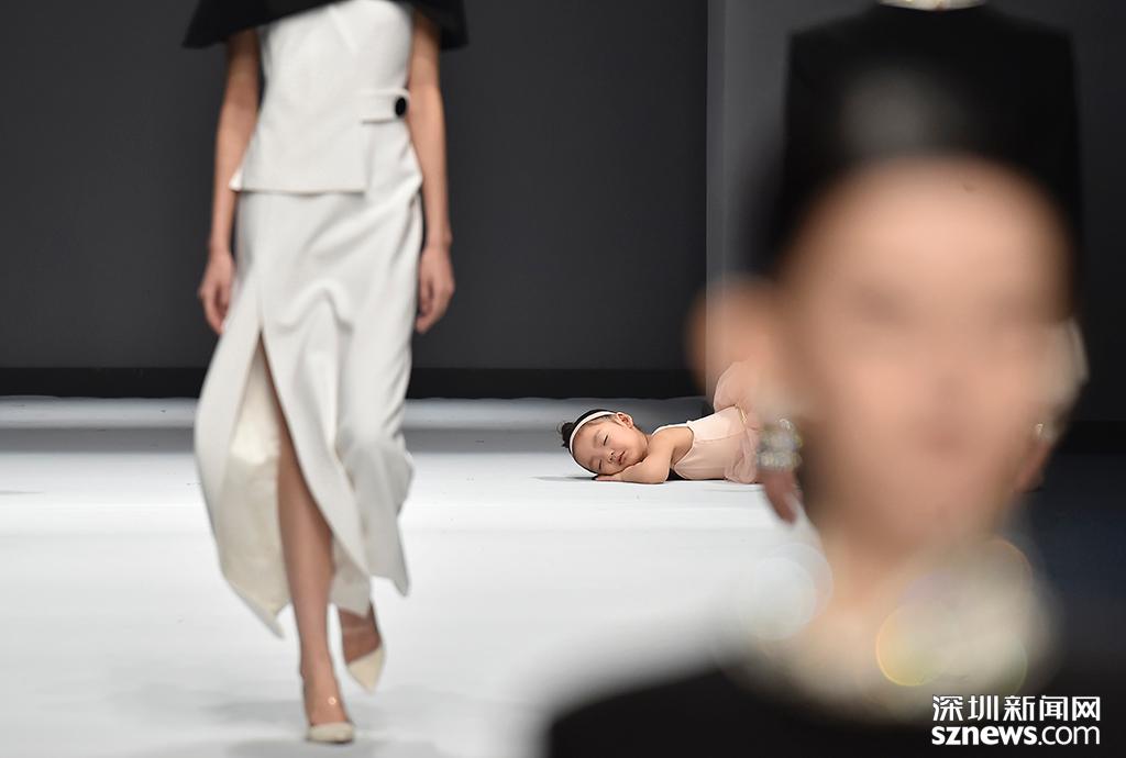品牌OBBLIGATO展示環(huán)節(jié),一位參展的小孩子趴在T臺上睡著了