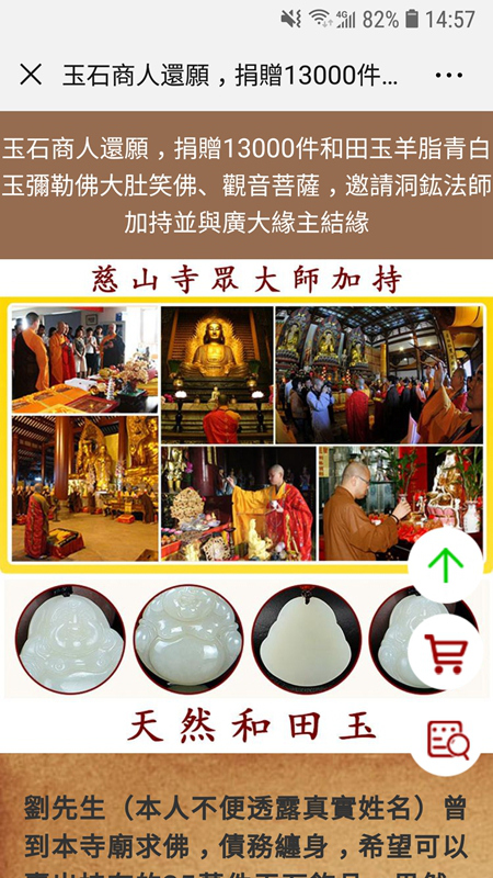 記者打開(kāi)警方提供的網(wǎng)站鏈接,隨即便出現(xiàn)了香港某知名寺院的頁(yè)面,上面有不同的法師主持不同法事的照片。照片上方,赫然寫(xiě)著"玉石商人還愿,捐贈(zèng)13000件和田玉羊脂青白玉彌勒佛大肚笑佛、觀音菩薩,邀請(qǐng) XX法師加持并與廣大緣主結(jié)緣"的字樣。接下來(lái)網(wǎng)頁(yè)上便講述了一個(gè)漏洞百出、文理不通的"傳奇故事"——