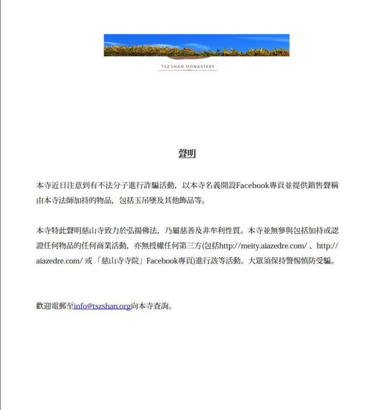 警方同時(shí)向深晚提供的證據(jù)中,還有一份香港某知名寺院的聲明。聲明中說(shuō):"本寺近日注意到有不法分子進(jìn)行詐騙活動(dòng),以本寺名義開(kāi)設(shè) Facebook專頁(yè)并提供銷售聲稱由本寺法師加持的物品,包括玉吊墜及其他物品等。本寺特此聲明,本寺并無(wú)參與加持或認(rèn)證任何物品的任何商業(yè)活動(dòng),亦無(wú)授權(quán)任何第三方進(jìn)行該等活動(dòng)。大眾須保持警惕慎防受騙。"