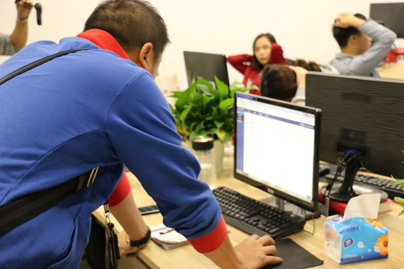 10分鐘后,深晚記者佯裝購(gòu)物,抵近詐騙團(tuán)伙老巢進(jìn)行觀察。記者發(fā)現(xiàn),在抓捕目標(biāo)附近的電梯、樓梯和通道處,都已有警方布置的監(jiān)視警力。透過(guò)位于廣場(chǎng)二樓的深圳市某光信息科技有限公司的玻璃門(mén),記者觀察到里面已有上百名員工上班,他們有的全神貫注地盯著辦公桌上的電腦,有的在打電話,渾然不知早已被警方包圍。