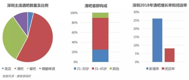 報告著重以夜店、清吧、餐吧、精釀啤酒吧為主要研究對象。其中,清吧的數(shù)量在主流酒吧業(yè)態(tài)中占比過半——2018年,清吧在深圳超過600家,占據(jù)市場的54%,開業(yè)量超過130家,閉店數(shù)則超過40家,精細(xì)運(yùn)營成為追求現(xiàn)象級爆紅的“網(wǎng)紅”酒吧發(fā)展的主要瓶頸。