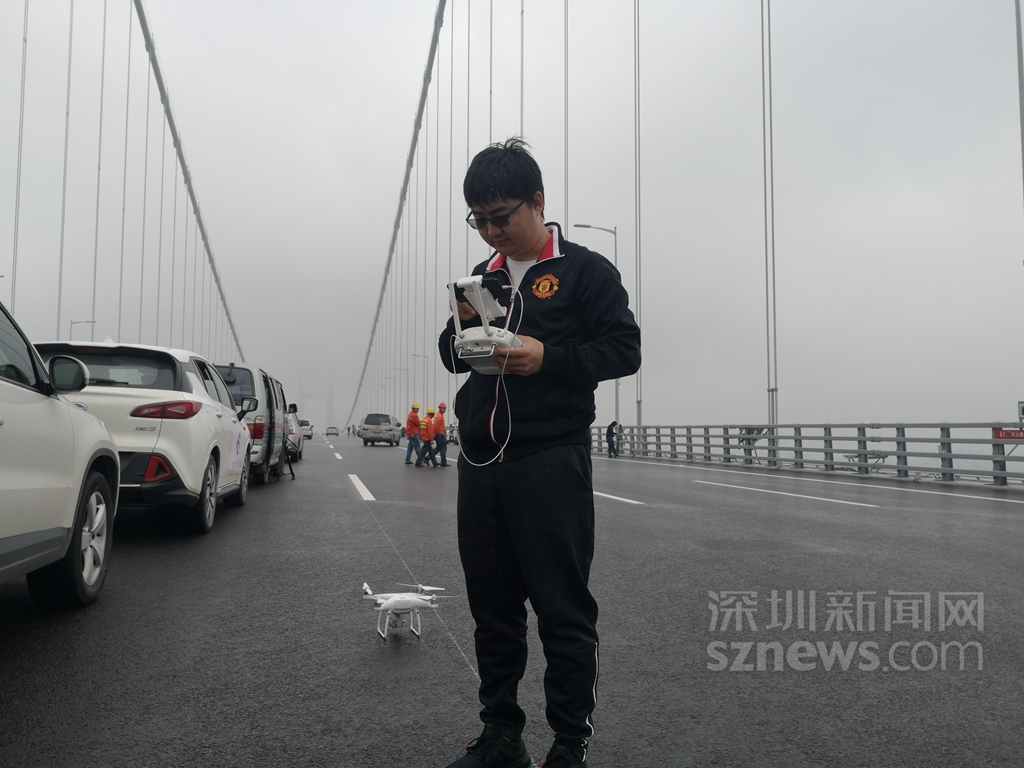 深圳新聞網(wǎng)記者齊釗遠(yuǎn)在橋面上調(diào)試無(wú)人機(jī),準(zhǔn)備航拍虎門(mén)二橋(現(xiàn)名南沙大橋)