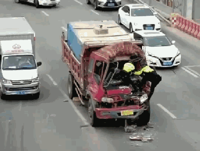 滾滾車流中,一輛車頭被撞凹的貨車,兩個(gè)爬上車頭的鐵騎,這是在做什么?