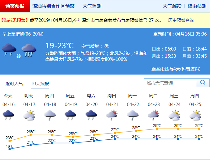 市氣象局預(yù)計(jì)17日降雨減弱,陣雨轉(zhuǎn)多云;18-20日,天氣仍不穩(wěn)定,多雷雨。21-22日,降雨趨于減弱。深圳市氣象臺2019-04-1605:36:00發(fā)布。