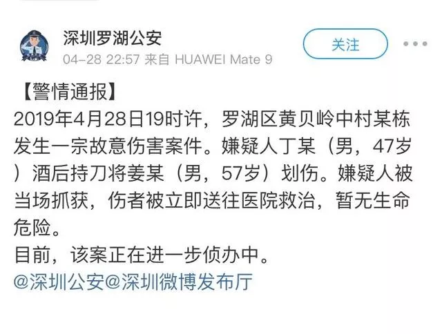 據(jù)記者了解,嫌疑人被當(dāng)場抓獲,傷者被立即送往醫(yī)院救治暫無生命危險(xiǎn)。羅湖公安也發(fā)布了警情通報(bào),行兇者是酒后持刀傷人,警方通報(bào)如下: