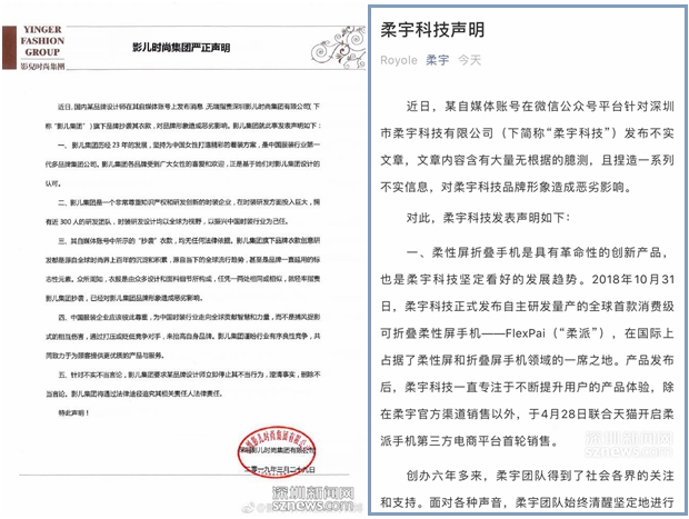 影兒時尚集團(左)和柔宇科技(右)聲明頁面截圖