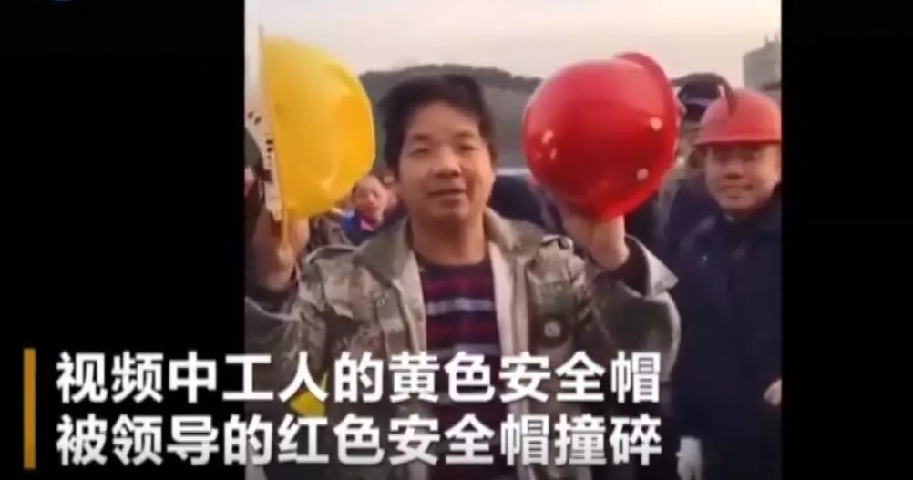 ▲視頻里,一位工人將手中兩種不一樣的安全帽對撞。其中,工人佩戴的黃色安全帽破裂,而“領導佩戴”的紅色安全帽完好無損。