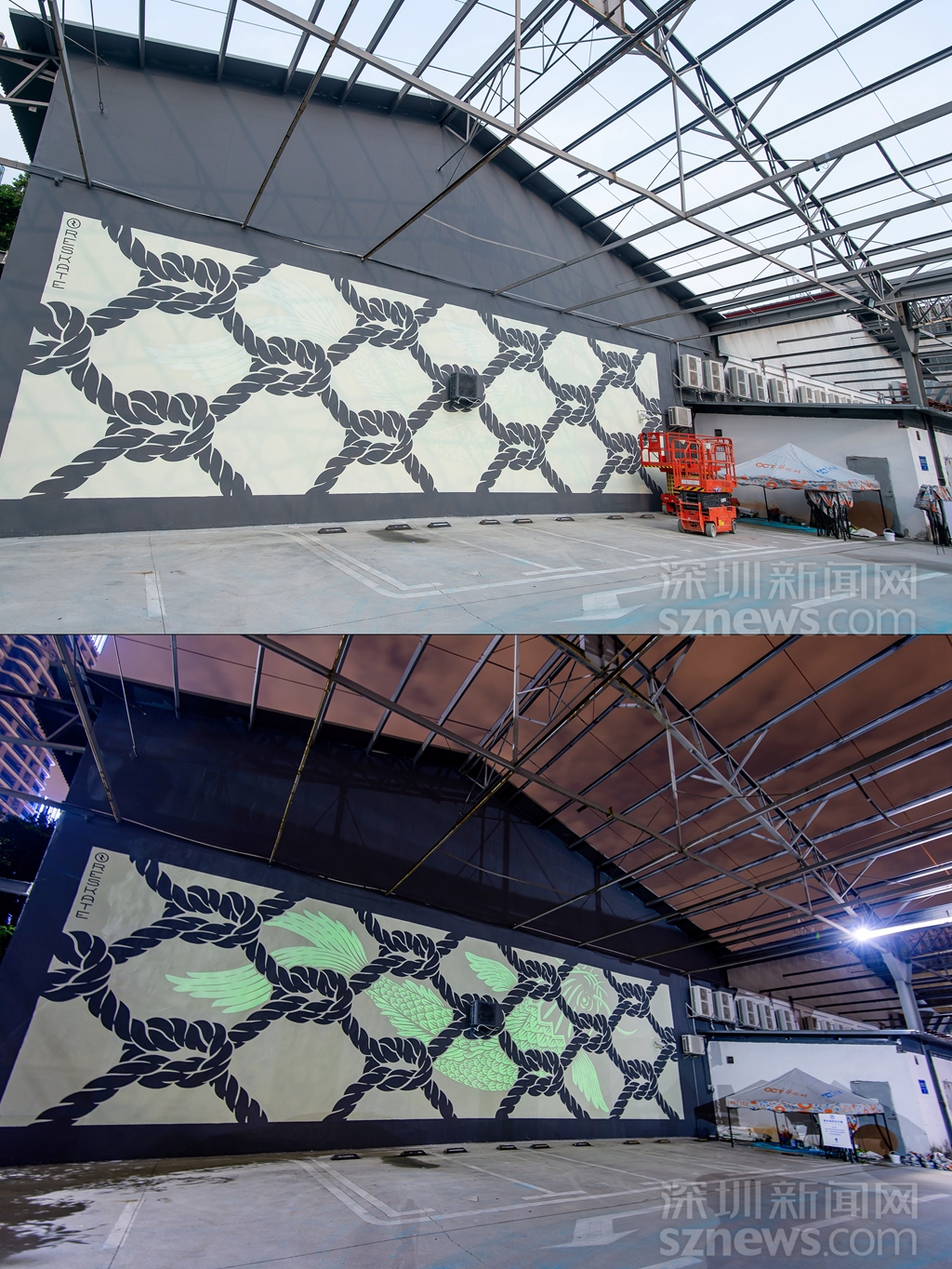 夜光涂鴉作品《連接》日與夜對比圖(主辦方供圖)
