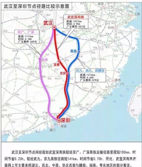 據(jù)了解,為了分流日益飽和的京廣高鐵客流,湖北提出擬在武漢和深圳之間建設(shè)一條高鐵。武深高鐵大致走向為:武漢 -咸寧 -修水 -銅鼓 -宜豐 -萬載 -宜春 -安福 -井岡山 -遂川 -贛州 -深圳。一旦建成,將形成武漢到深圳的一條筆直線路。初步預(yù)測分析,新規(guī)劃的武漢至深圳高速鐵路,較經(jīng)京廣、廣深高鐵運輸徑路里程短100多公里,時間節(jié)省20分鐘;較經(jīng)武九、京九高鐵徑路短141公里,時間節(jié)省42分鐘。
