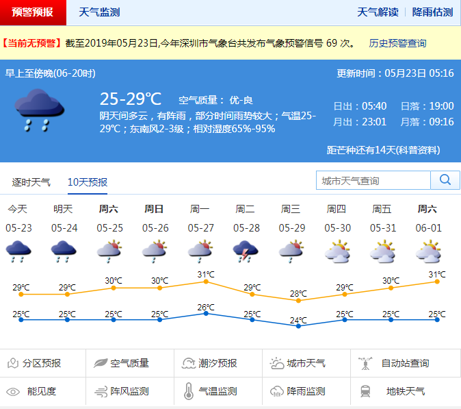 深圳新聞網(wǎng)2019年5月23日訊 21日夜間至22日白天,寶安、光明和南山出現(xiàn)大雨,其他地區(qū)出現(xiàn)小雨。預(yù)計(jì)今明兩日我市陰天到多云,有中到大雨,局部暴雨;25-27日多云為主,有短時(shí)陣雨或雷陣雨;28日有雷陣雨;29日多云有短時(shí)陣雨。