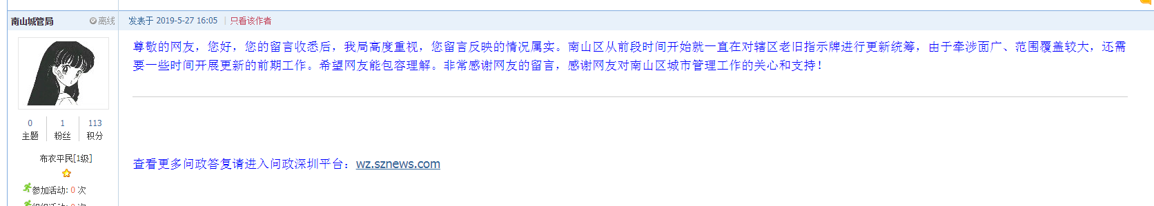 為及時(shí)解決網(wǎng)友疑問(wèn),5月27日下午,南山城管局在網(wǎng)友“syh19667288”發(fā)布的帖文下給予回復(fù)稱(chēng)需要時(shí)間來(lái)開(kāi)展更新工作。具體回復(fù)如下:
