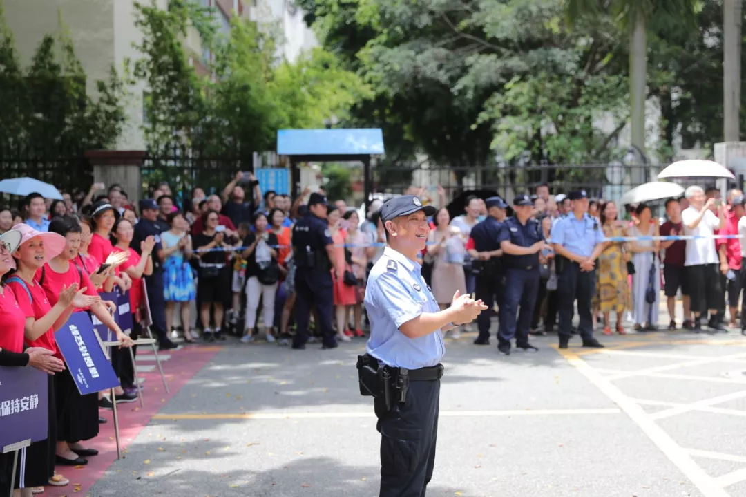 △當(dāng)?shù)谝晃豢忌叱錾钲趯?shí)驗學(xué)校中學(xué)部考場時,通心嶺派出所所長林志強(qiáng)與現(xiàn)場家長為其鼓掌喝彩。