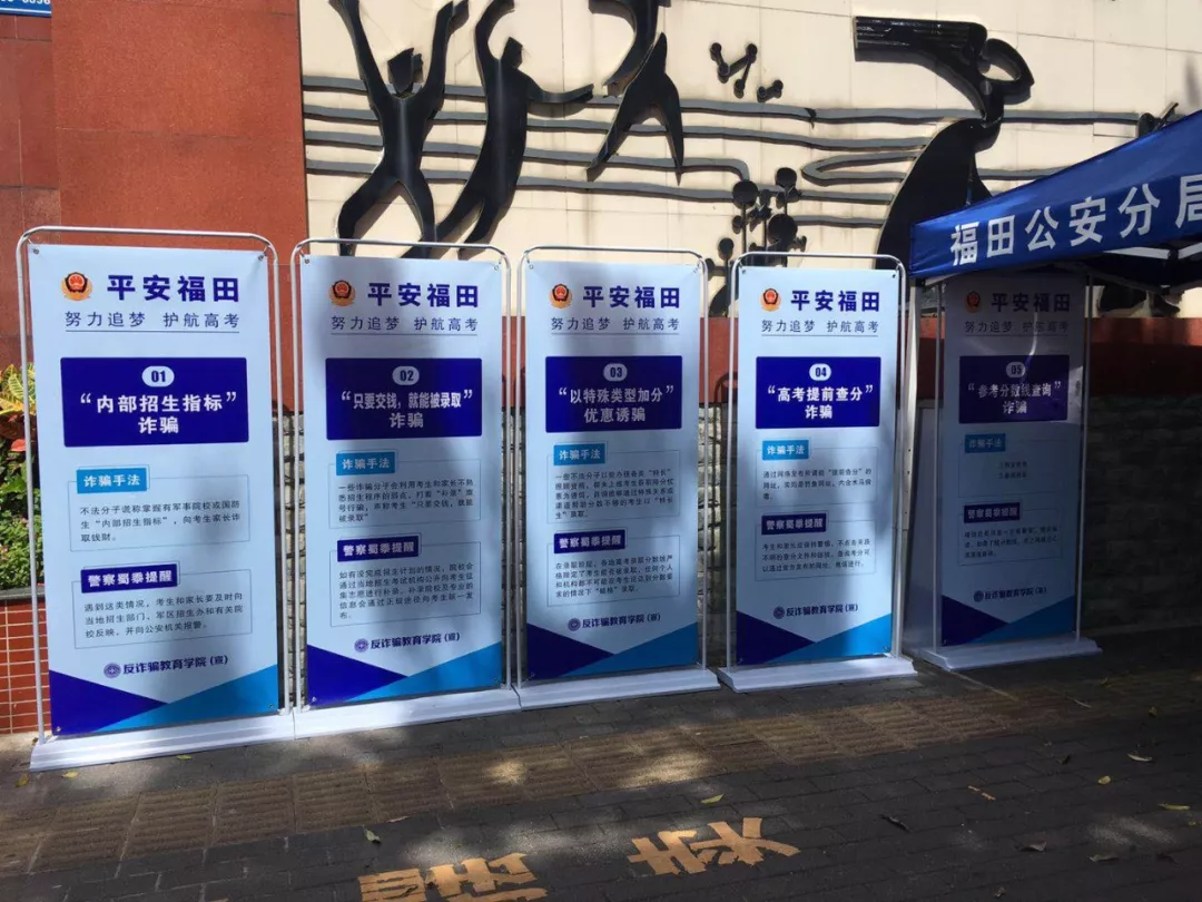 高考結(jié)束后,與高考相關(guān)的一些詐騙也進(jìn)入了活躍高峰期。福田分局制作了高考反詐騙相關(guān)展板,在全區(qū)范圍內(nèi)的6個考點(diǎn)出入口顯眼處擺放,提醒告誡考生及家長注意高考相關(guān)詐騙手法。