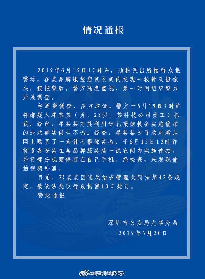 6月19日,深圳市一家優(yōu)衣庫門店暗藏針孔攝像頭一事有了最新進展。龍華警方表示,嫌疑人鄧某某(男,28歲)已被抓獲,其為某科技公司員工,為求刺激安裝,目前被依法處以行拘10日處罰,未發(fā)現(xiàn)視頻外泄。多地多起偷拍事件頻發(fā),證明這不是孤立的個案。想管住日漸泛濫的針孔攝像頭,不能僅靠公眾每次住宿時的“偵探式”自救和“地毯式”搜查,諸多應(yīng)對的方法也難逃人性與欲望的丑惡。涉事的優(yōu)衣庫門店在事發(fā)時曾表示,檢查試衣間只檢查是否有顧客遺留物品,而此前某涉事酒店負責人以攝像頭安裝隱蔽、工作人員難以發(fā)現(xiàn)、不專業(yè)為由,回避問題。店家事后的說辭讓人心生涼意,大事化小、小事化了的補救措施也不能消除消費者心中的恐懼,作為管理方尚且如此態(tài)度,作為弱勢群體的消費者,還需要多少案例才能換來隱私的保障?