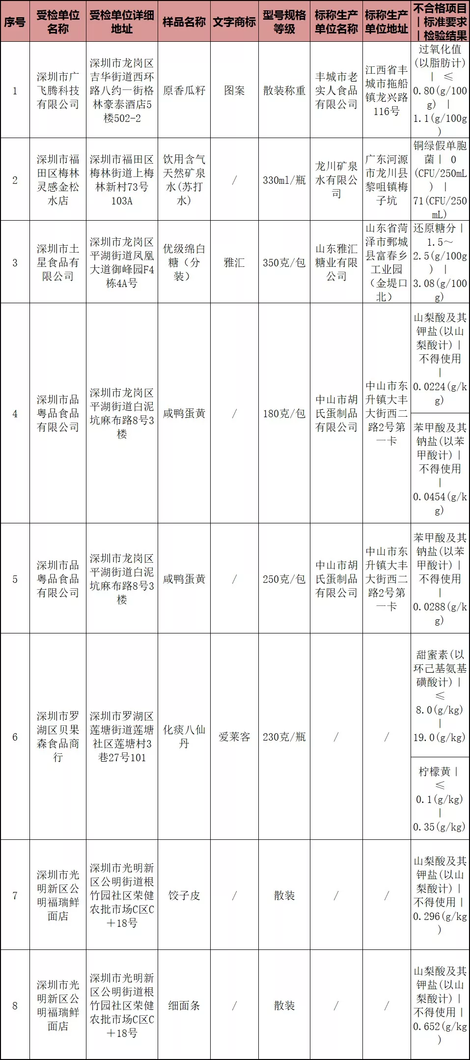本次共抽檢生產(chǎn)、流通、餐飲環(huán)節(jié)食品619批次,涉及生產(chǎn)、流通、餐飲環(huán)節(jié)經(jīng)營主體275家次,共檢測食品指標(biāo)3614項次。其中檢出不合格樣品8批次,涉及不合格食品類別有炒貨食品及堅果制品1批次,蛋制品2批次,糧食加工品2批次,食糖1批次,水果制品1批次,飲料1批次;涉及不合格項目類別為微生物污染、食品添加劑、品質(zhì)指標(biāo)。