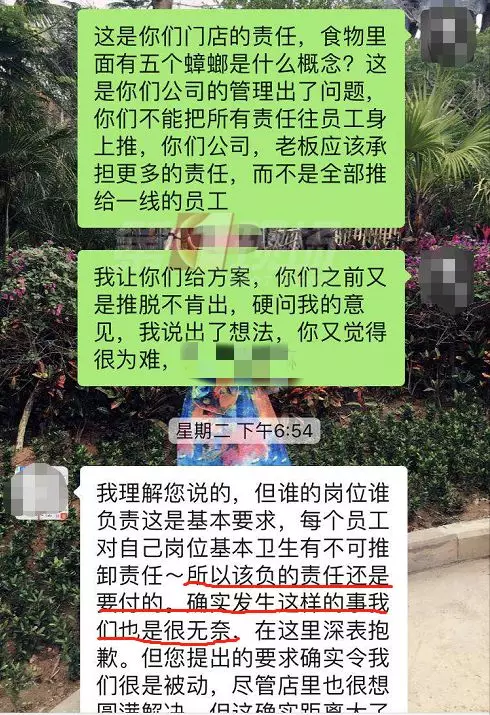 康先生拍了現(xiàn)場(chǎng)的照片,因?yàn)楦糁w,可以看到有多個(gè)小黑點(diǎn),但很難一眼辨認(rèn)出是小蟑螂。不過(guò),從康先生提供的微信聊天記錄可以看出,店方承認(rèn)他們員工有疏忽,也派負(fù)責(zé)人跟康先生溝通賠償問(wèn)題??迪壬硎镜昙以敢赓r償1000元,但他感覺對(duì)自己的精神影響很大,并不同意。
