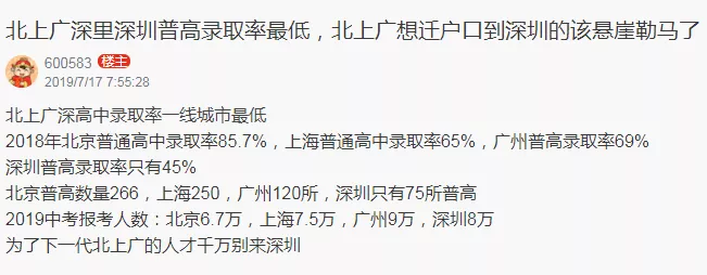 “家在深圳”論壇也有網(wǎng)友爆料,北上廣深四個一線城市里,數(shù)深圳的普高錄取率最低。