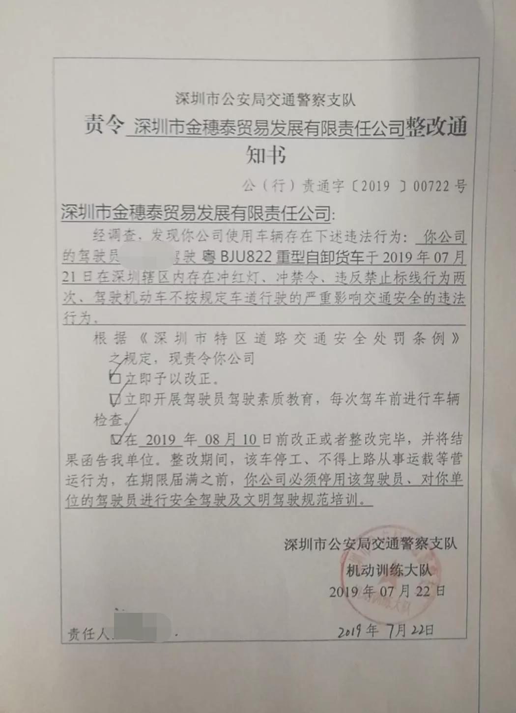 2019年7月21日,深圳交警接群眾舉報稱,粵BJU822號泥頭車存在妨礙交通安全駕駛的行為。