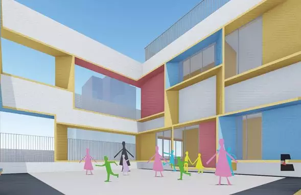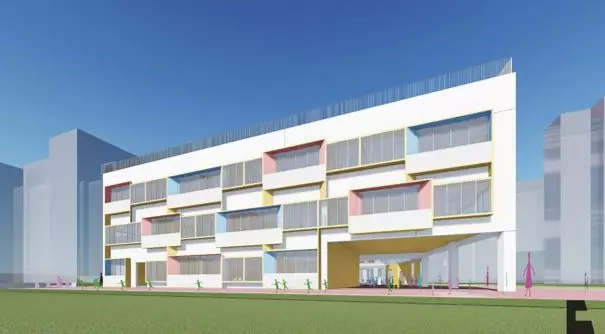 項目用地緊張且形狀不規(guī)則,與周邊建筑距離較近。在被3小時日照線及周邊建筑最近點的18米范圍線切割的用地上布置幼兒生活用房,同時保證主要的幼兒生活用房(即班級活動單元)南向采光。在滿足功能需求的前提下,首層最大范圍的架空,并與室外活動場地、綠地形成一體,南北連通,為幼兒提供開敞的室外活動空間。