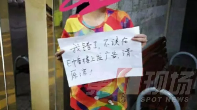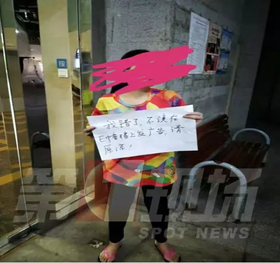 ▲女子手持道歉牌,上面寫著:“我錯(cuò)了,不應(yīng)該在E棟樓上發(fā)廣告,請(qǐng)?jiān)彙?/p>
