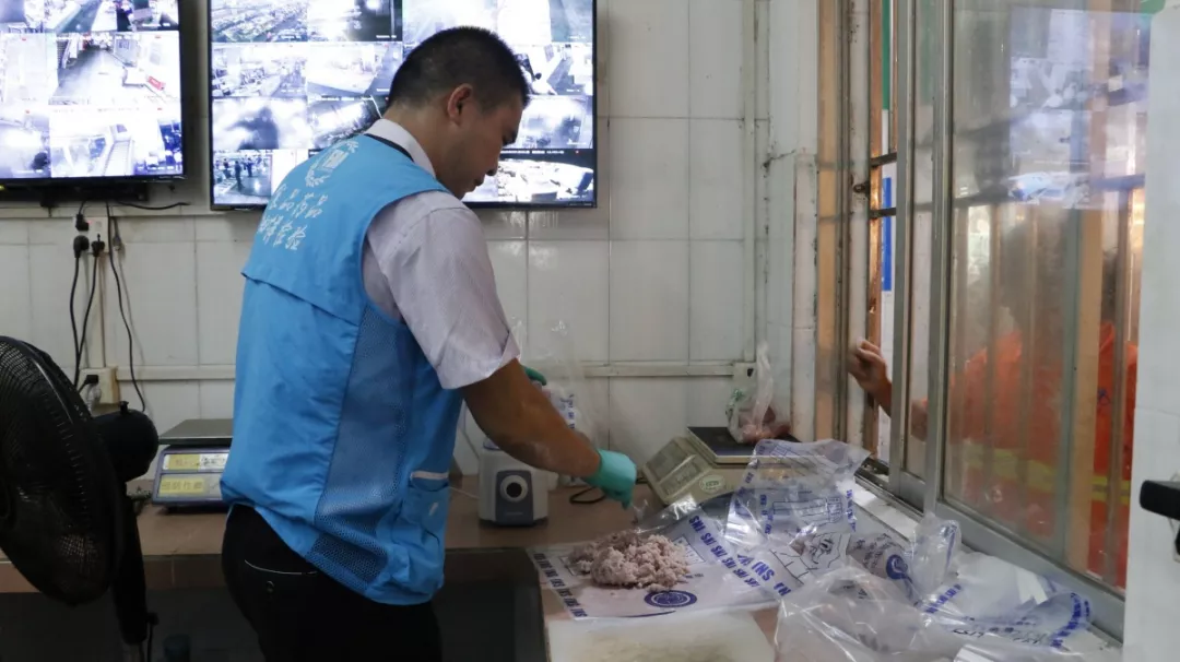執(zhí)法人員根據(jù)市場開辦方提供的市場檔位明細(xì)表,首先隨機選取了市場內(nèi)的肉檔、水產(chǎn)品檔、菜檔,逐一進行檢查,對檔位的營業(yè)執(zhí)照、臺賬建立情況檢查無誤后,執(zhí)法人員又隨機指定了檢查品種,由快檢人員現(xiàn)場開展快檢工作。