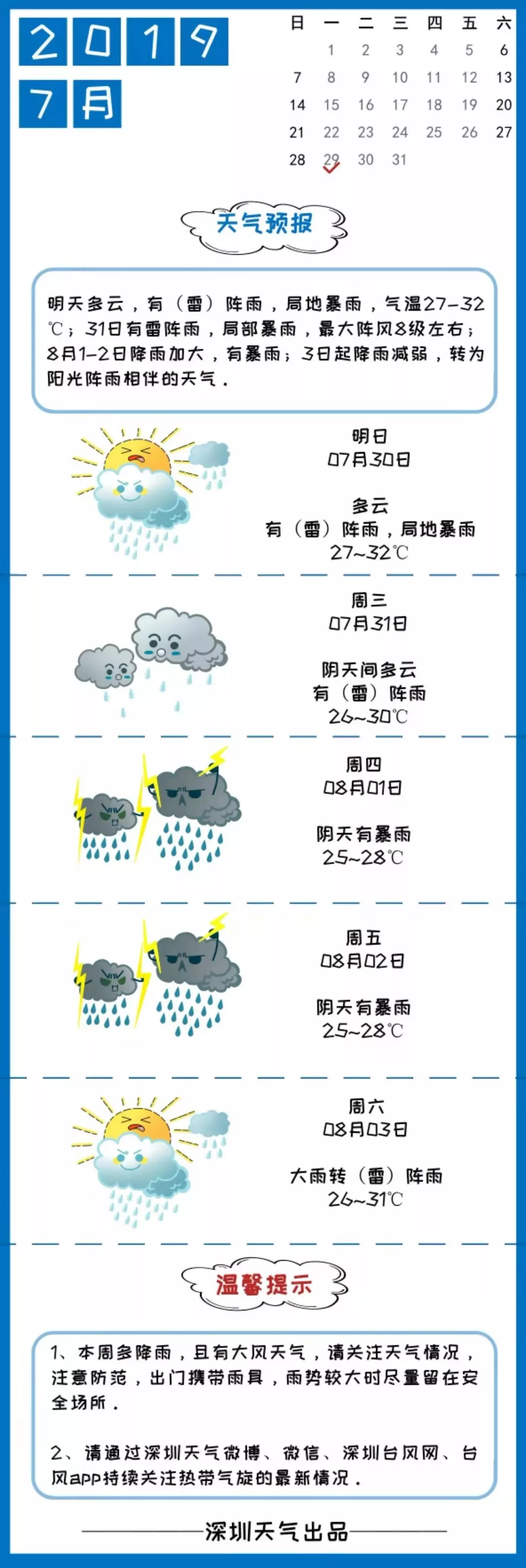 周一至周三有雷陣雨,局部暴雨;周四至周五有一次暴雨降水過程;周末期間(8月3-4日)有陣雨或雷陣雨。