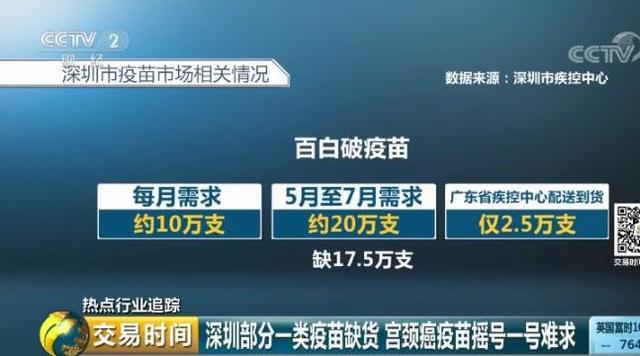前幾天,深圳市疾控中心表示,深圳市一類疫苗缺口達(dá)17.5萬支,其中兒童疫苗百白破、麻風(fēng)疫苗及麻腮風(fēng)疫苗短缺,而成人宮頸癌的疫苗更是嚴(yán)重缺貨。