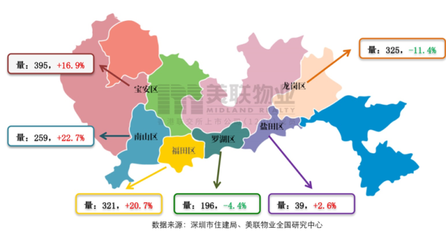 各區(qū)具體成交量及環(huán)比增減幅度差異明顯。其中龍崗成交233套,雖環(huán)比下降12.4%,但總量仍居全市首位;寶安成交162套,位居全市第二位,成交量環(huán)比下降25.3%。此外,龍華和光明并列成為上周一手住宅成交量環(huán)比上升幅度最大的區(qū)域,均增長1.6倍,分別增至74和62套。而羅湖區(qū)盡管成交套數(shù)也大幅增長達1倍,但是羅湖區(qū)新房較少,即使增長一倍也僅有6套成交。