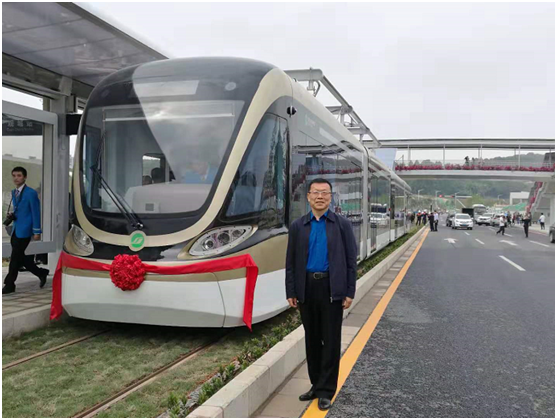 深圳龍華現(xiàn)代有軌電車開通現(xiàn)場(chǎng),簡(jiǎn)煉與電容供電無(wú)接觸網(wǎng)的有軌電車合影。