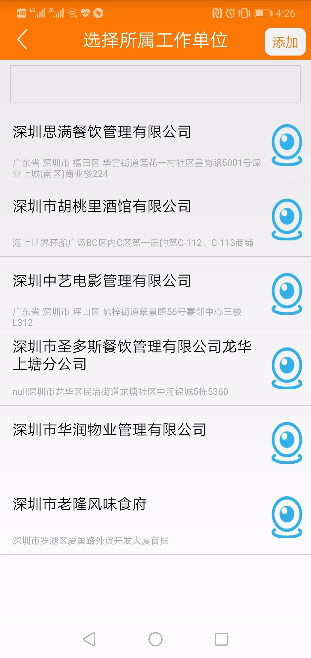 在選擇所屬單位時,可以通過搜索“名稱關(guān)鍵詞”快速查詢,如果沒有你的餐廳或單位名字,可以點右上角的【添加】來添加。