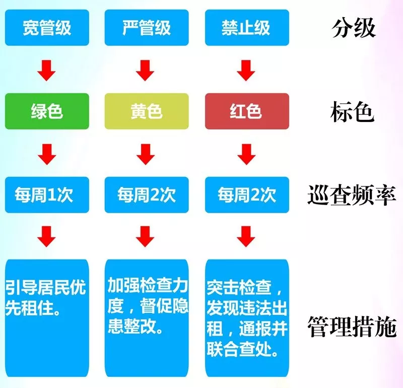 出租屋將分為寬管級(jí)(綠標(biāo))、關(guān)注級(jí)(黃標(biāo))、嚴(yán)管級(jí)(橙標(biāo))、禁止級(jí)(紅標(biāo))四個(gè)級(jí)別。結(jié)合房屋二維碼對(duì)四個(gè)級(jí)別實(shí)行動(dòng)態(tài)標(biāo)色管理,以房屋二維碼的底色來(lái)標(biāo)注。