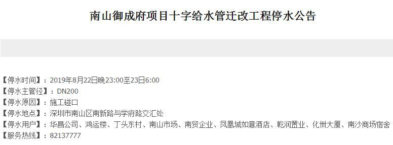 停水用戶:華昌公司、鴻運樓、丁頭東村、南山市場、南貿(mào)企業(yè)、鳳凰城如意酒店、乾潤置業(yè)、化卌大廈、南沙商場宿舍