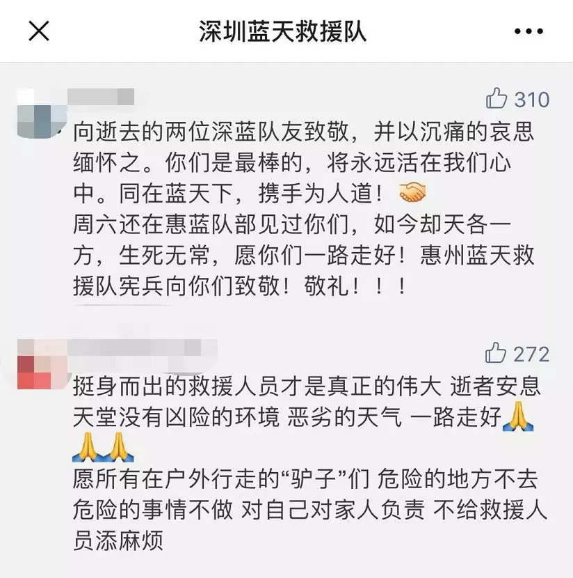 在深圳藍(lán)天救援隊(duì)微信留言中,有隊(duì)員悲痛惋惜隊(duì)友的離去,也有人質(zhì)疑驢友,明知惡劣天氣卻還要前往山野探險(xiǎn),這種行為是對(duì)自己對(duì)他人生命的不負(fù)責(zé)。