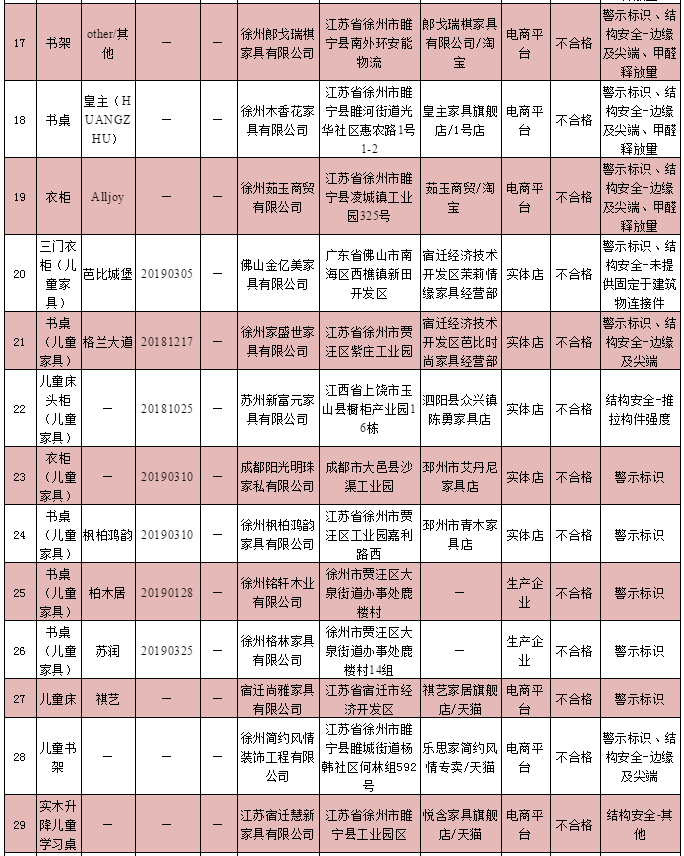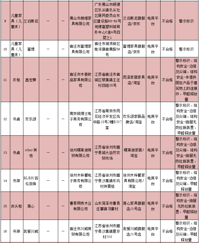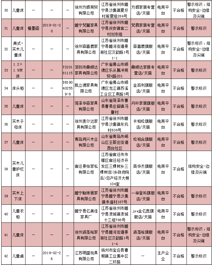 兒童家具產品質量監(jiān)督抽查不合格企業(yè)名單