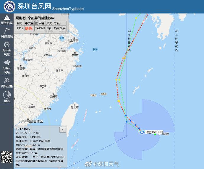 據(jù)深圳市氣象臺消息,原位于西北太平洋洋面的熱帶低壓于9月19日14時(shí)加強(qiáng)為今年第17號臺風(fēng)“塔巴”(名字來源:馬來西亞,意為一種淡水魚),其中心位于日本沖繩縣那霸市南偏東方向約435公里的洋面上,中心附近最大風(fēng)力8級。