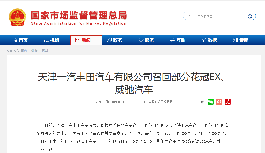 日前,天津一汽豐田汽車有限公司根據(jù)《缺陷汽車產(chǎn)品召回管理條例》和《缺陷汽車產(chǎn)品召回管理條例實施辦法》的要求,向國家市場監(jiān)督管理總局備案了召回計劃。決定自即日起,召回2003年4月16日至2008年1月30日期間生產(chǎn)的125825輛威馳汽車、2004年1月7日至2008年12月25日期間生產(chǎn)的313028輛花冠EX汽車,共計438853輛。