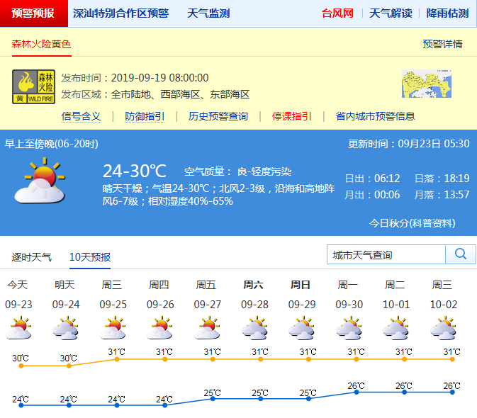 見(jiàn)圳客戶(hù)端·深圳新聞網(wǎng)2019年9月23日訊 深圳市氣象局今天晴天干燥;氣溫24-30℃;北風(fēng)3級(jí),陣風(fēng)8級(jí);相對(duì)濕度40%-65%。預(yù)計(jì)24-27日多云間晴天為主,濕度略有增加,部分時(shí)間有短時(shí)陣雨。