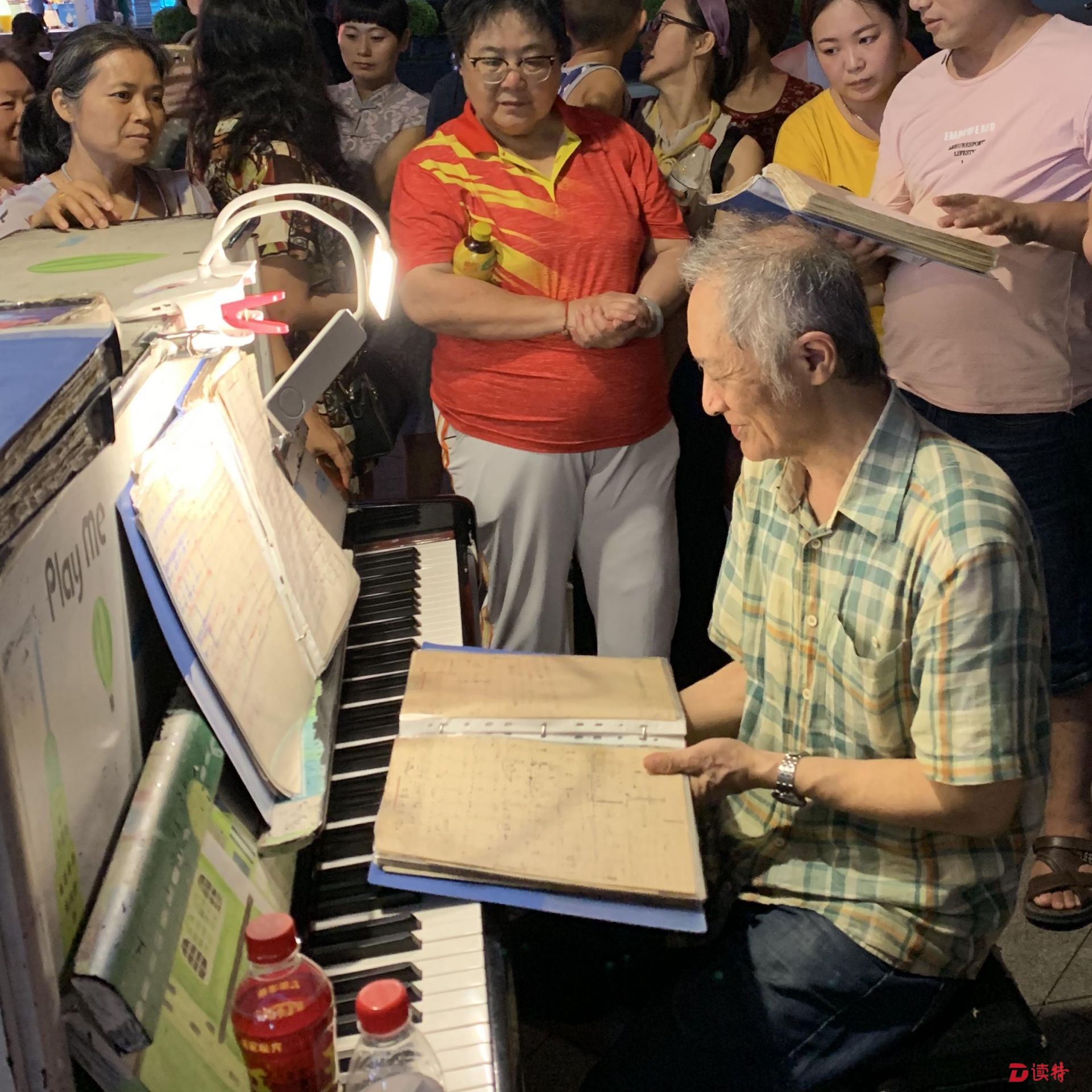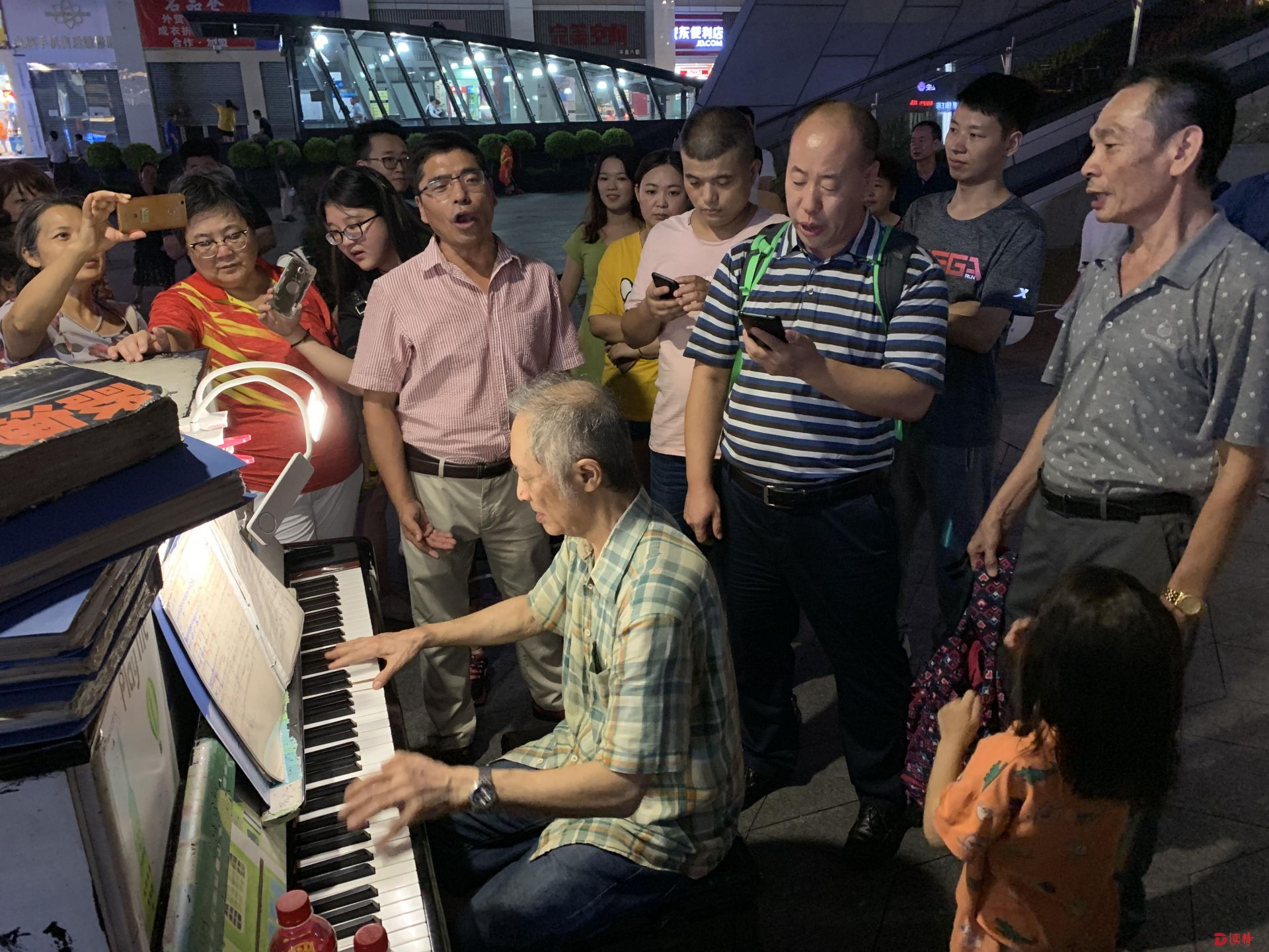 深圳特區(qū)報2019年9月23日訊 每天晚上9點,一場小型的“鋼琴音樂會”準(zhǔn)時在華強北商業(yè)街上演。“音樂會”的聽眾默契地圍在鋼琴邊上,一首接一首地給坐在琴凳上的老人點歌。