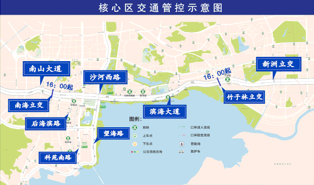 以深圳灣人才公園為中心,濱海大道(南海立交至竹子林立交段雙方向)、沙河西路(濱海大道至東濱立交雙方向)、望海路(東濱立交至中心段雙方向)、中心路(科苑南路至望海路雙方向)、科苑南路(東濱路至中心路段東側(cè))、東濱路(后海濱路至科苑南路段,不含)、后海濱路(濱海大道至東濱路,不含)的合圍區(qū)域?qū)嵤┙煌ü苤疲灰约盀I海大道東往西方向(竹子林立交至南海立交),西往東方向(南海立交至竹子林立交)實施交通管制。