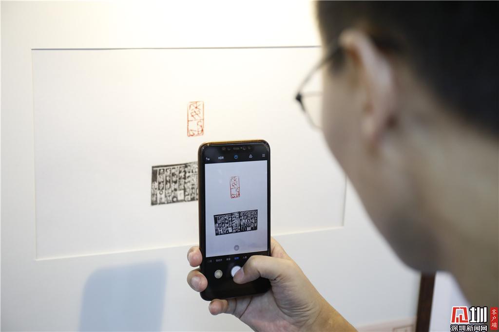 一位參觀者拿起手機拍下展覽作品