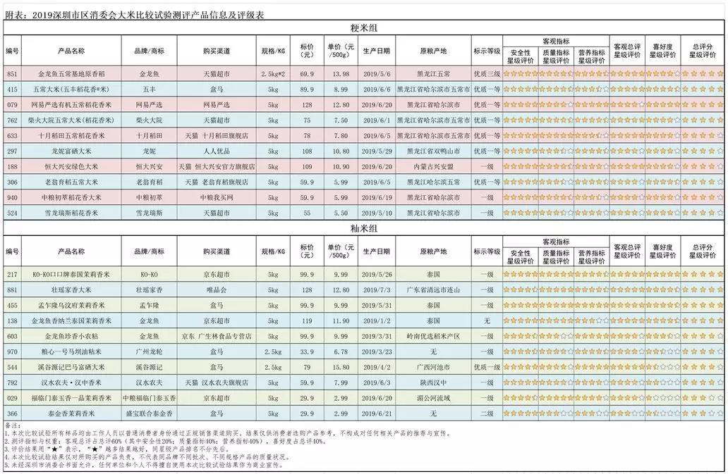 大米比較試驗(yàn)測評產(chǎn)品信息及評級表↓