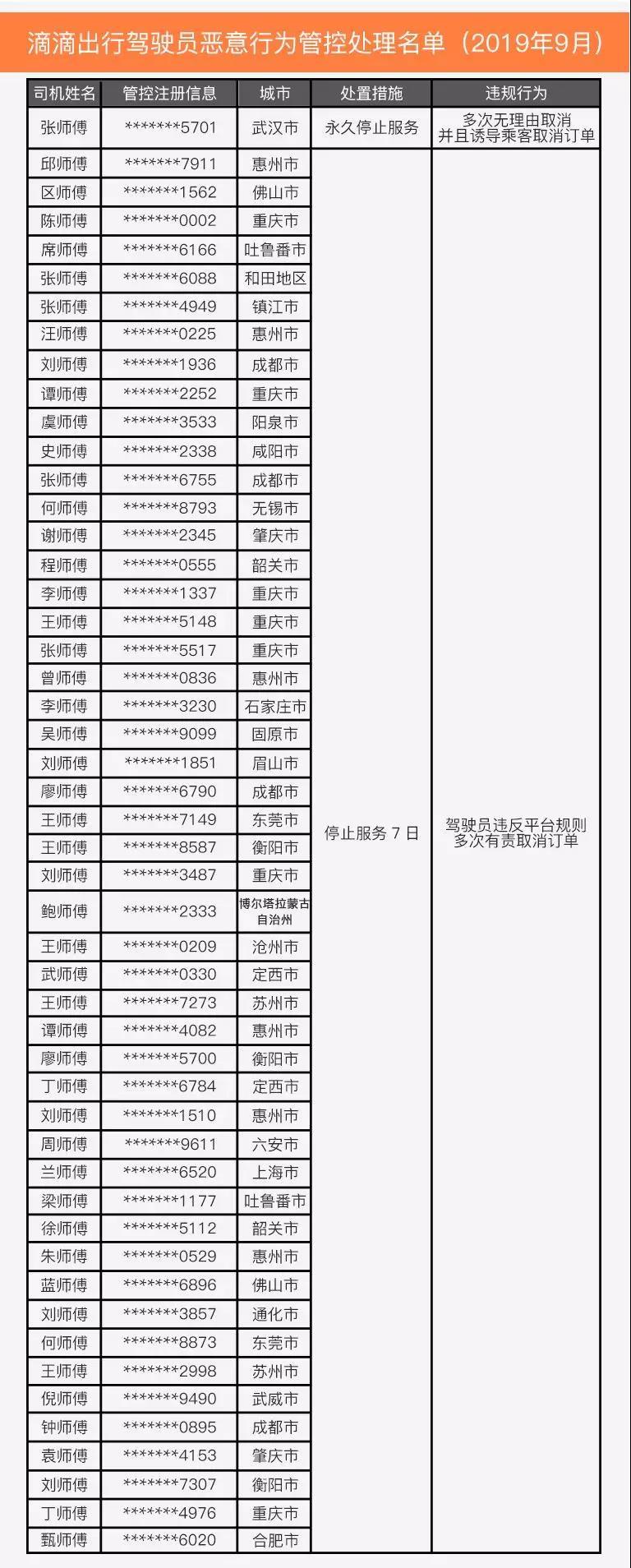 晶報2019年10月25日訊 昨日(24日),滴滴出行微信公眾號公示2019年9月部分虛假投訴的乘客以及存在惡意行為的駕駛員名單,名單中包括27名乘客和50名司機。