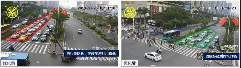 10月2日,針對(duì)車道劃分與交通需求不匹配的問題,調(diào)整北進(jìn)口車道劃分,由2左轉(zhuǎn)2直行調(diào)整為1左轉(zhuǎn)3直行,并調(diào)整路口紅綠燈方案,適當(dāng)增加北方向單放綠燈時(shí)間,降低南、北對(duì)直綠燈時(shí)間。優(yōu)化后,北方向通行效率提升明顯,晚高峰期間小時(shí)通過量由820pcu/h提高至980pcu/h,提升19.5%。