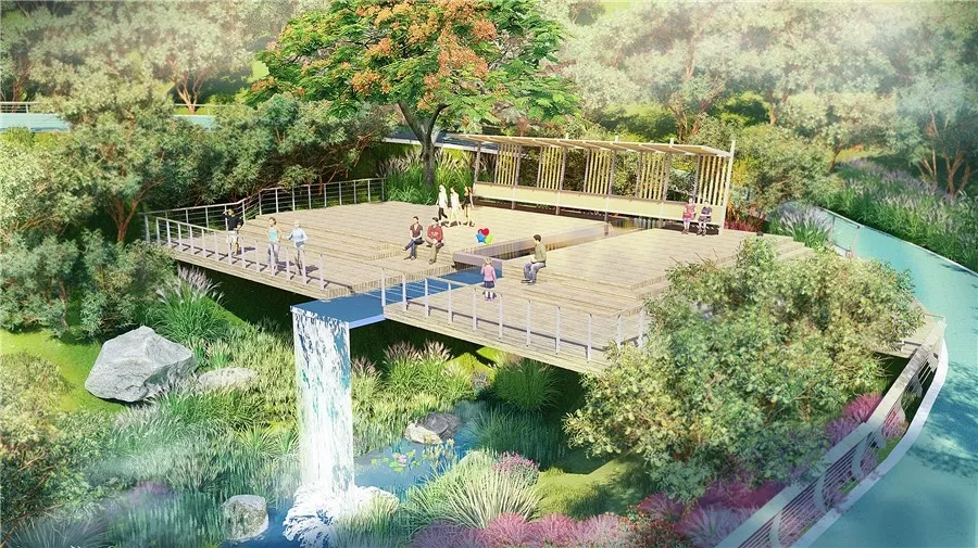 天然的溪谷,沿線配上蝴蝶花、天堂鳥、鳶尾等寓意幸福的開花植物,營造出一片繁花似錦、彩蝶紛飛的溫馨景觀,代表著人才在深圳奮斗的成果,也寓意著人才內(nèi)心滿滿的幸福感。