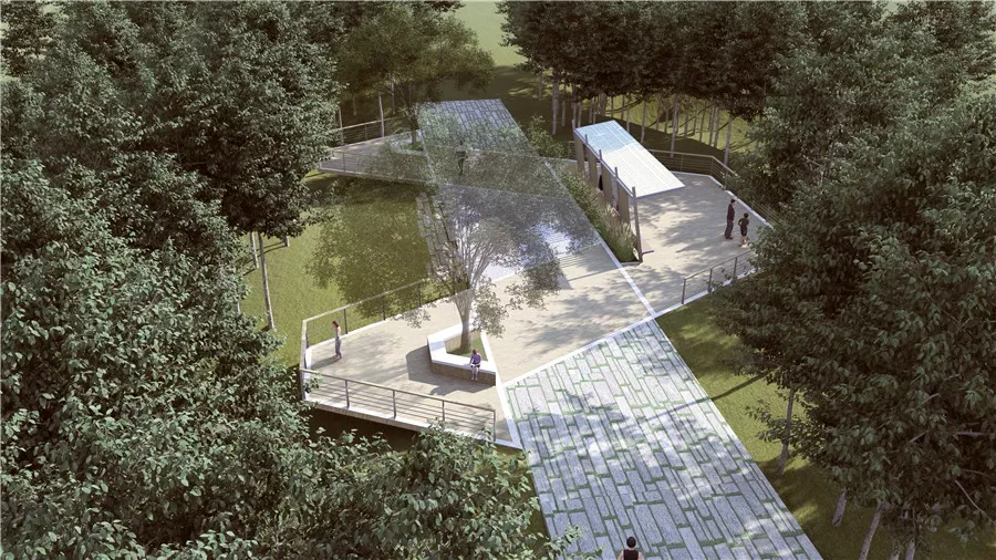 利用現(xiàn)狀平臺(tái)進(jìn)行改造提升,場(chǎng)地形式由“人”字演化而來,廊架也取自“人”形元素進(jìn)行設(shè)計(jì),平臺(tái)北向俯瞰群賢廣場(chǎng),南面則朝向求知花園,具有一攬眾英才之意。