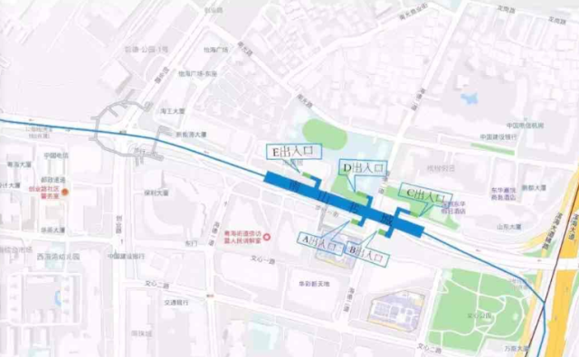 南山書城站位于南海大道與海德二道交叉口處,車站出入口共計6個,A出入口位于海雅百貨西側(cè),B出入口位于南山書城西側(cè),C出入口位于美奧口腔醫(yī)院北側(cè),D出入口位于南油小學(xué)東側(cè),E出入口位于海典居?xùn)|側(cè),H出入口位于青春家園西側(cè)