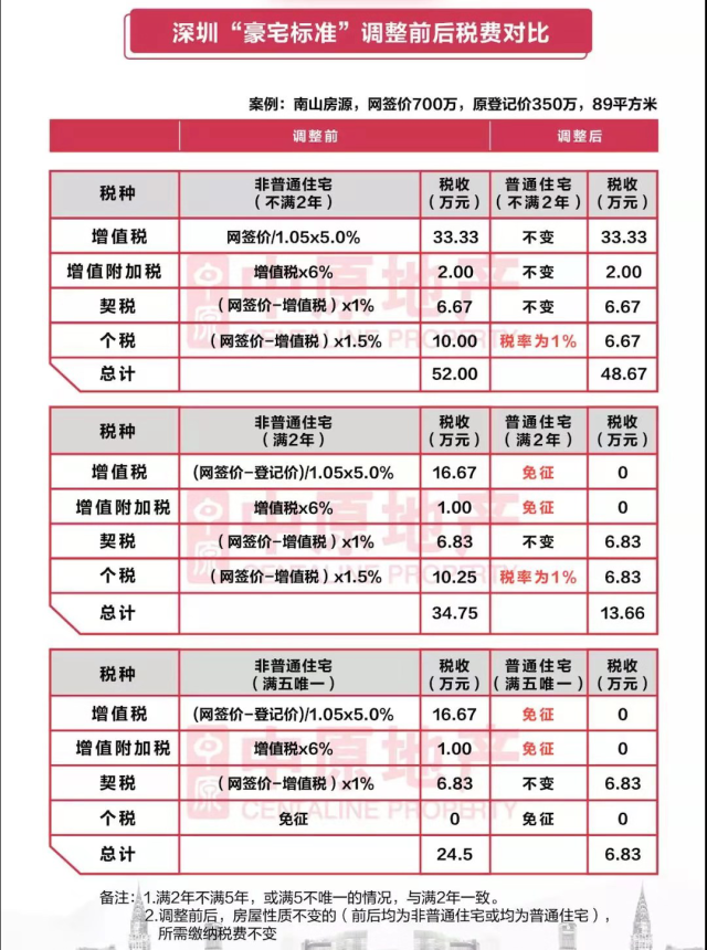深圳“豪宅標準”調整前后稅費對比。來自深圳中原研究中心