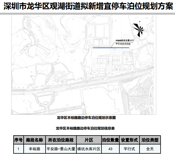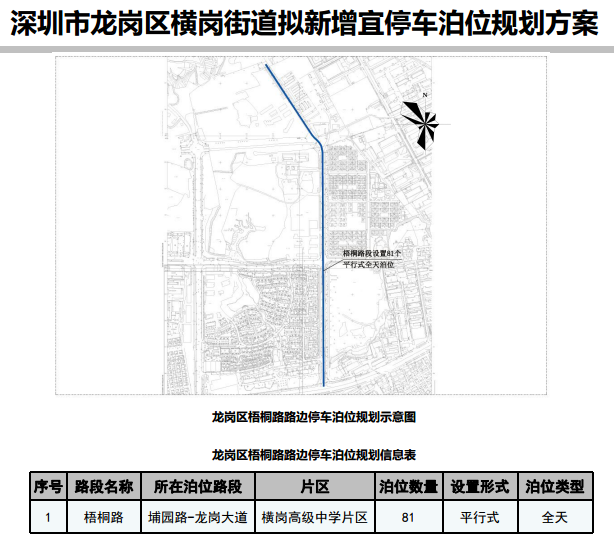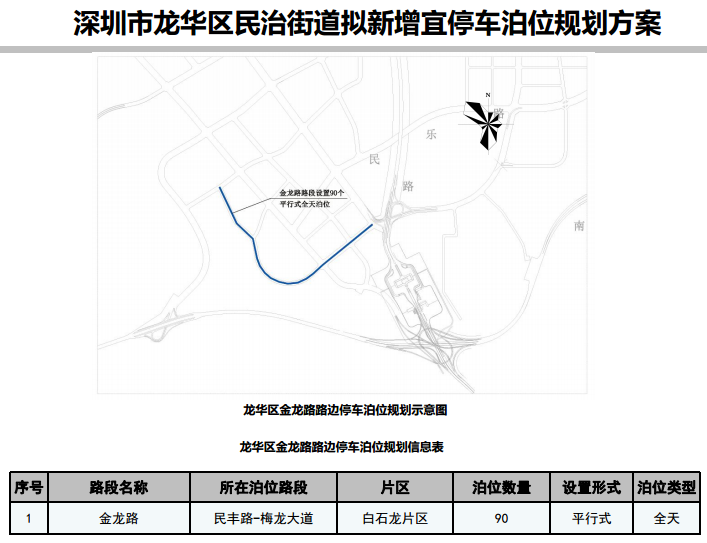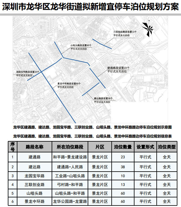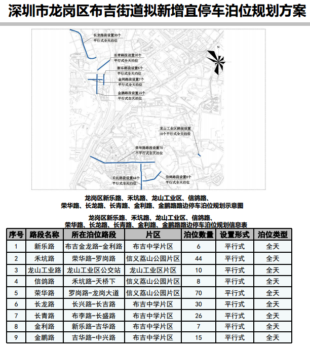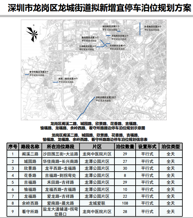 其中,在寶安區(qū)3條道路新增316個宜停車泊位、龍崗區(qū)23條道路新增890個宜停車泊位、龍華區(qū)14條道路新增702個宜停車泊位、光明區(qū)9條道路新增305個宜停車泊位、大鵬新區(qū)5條道路新增157個宜停車泊位。具體規(guī)劃方案如下: