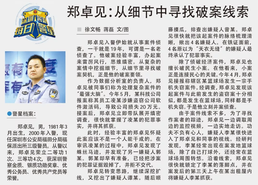 除了偵破經(jīng)濟(jì)案件,鄭卓見也擅長破民生小案。在他看來,小案正是連接民心的關(guān)鍵。今年4月,鄭卓見接報(bào)稱轄區(qū)某籃球場發(fā)生一宗手機(jī)失竊案件。經(jīng)調(diào)查,鄭卓見發(fā)現(xiàn)該起案件與此前發(fā)生的盜竊案十分相似,都是發(fā)生在籃球場,同樣都是手機(jī)失竊。于是他立刻并案偵查。